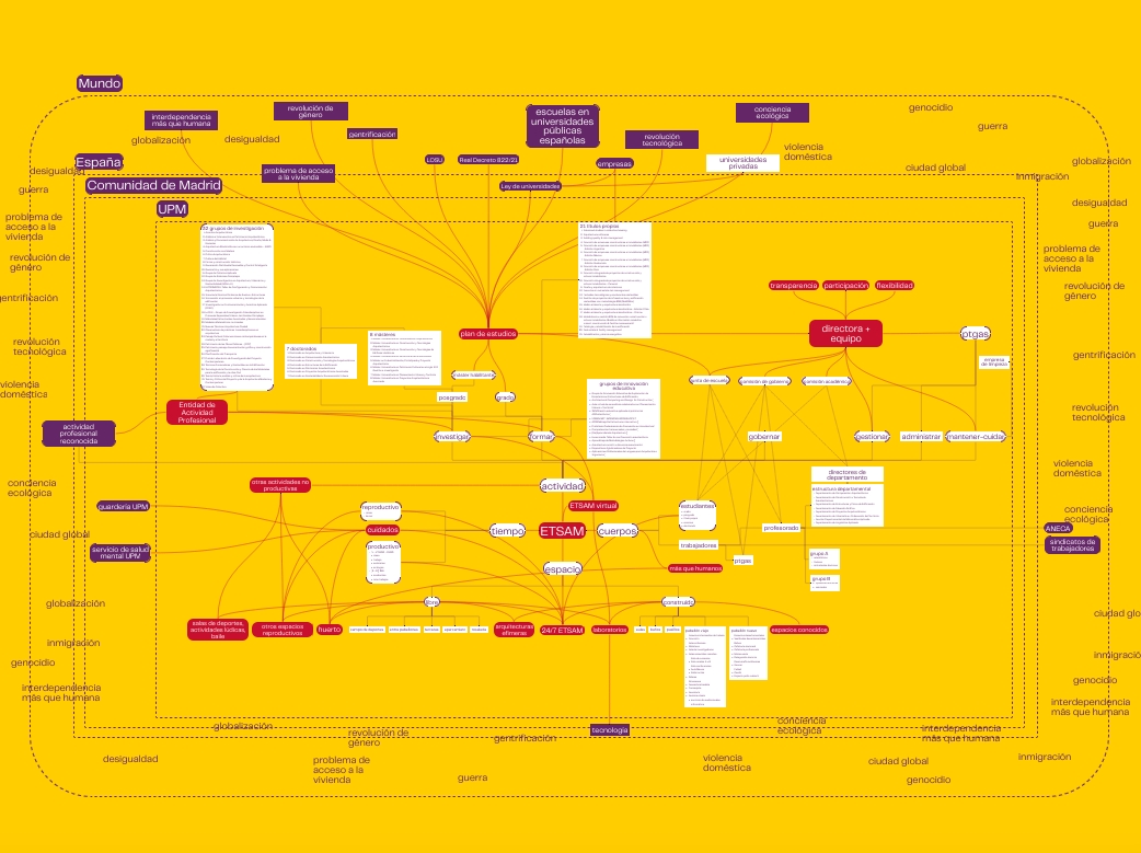 Y en este extraño escenario con cierto carácter heterotópico, de no_lugar, de cruces de miradas entre desconocidos, unos llegan y otros se van como si fuera un aeropuerto. Artículos, estancias, cursos de formación, proyectos de innovación, dirección de tfgs, de tfms, de tesis, congresos virtuales, siempre ocupadas todo el día incluso a costa de la docencia. Cada vez más alumnos para menos trabajadores: ¡más madera! ¡más madera! Tanto en las aulas, como en los despachos, en los pasillos o en secretaría cada vez somos menos, en muchos casos invisibles y a menudo poco o nada valoradas. Desaparecieron Alicia, Elo, Carmen, Gloria,... y últimamente Isabel : cuánto te vamos a echar de menos los de la tarde!. No sabemos los nombres de los demás e incluso siguen preguntando por "el bedel de la planta y" que falleció hace tiempo, también en silencio. Hemos normalizado ignorar quienes limpian nuestros espacios, abren nuestras aulas, matriculan a nuestros alumnos, colocan el papel higiénico y sellan nuestros certificados. Desconocemos quién se jubila, quiénes han huido y quiénes se han muerto. Pero incluso entre los vivos, entre los que permanecemos, ni idea de quién eres!. La falta de comunicación entre las distintas comunidades de la ETSAM no es solo una cuestión afectiva, que también, es una cuestión de cuidados recíprocos ( y de esto si que soy experta number one) La falta de información y de transparencia en la actividad académica, de gestión y administración, la descoordinación y desconocimiento entre los departamentos, sus profesores, sus asignaturas y sus investigaciones conducen a peleas de gallos impropias en una universidad pública. Nunca se pidió a la ETSAM que fuera una escuela cuidadora porque los cuidados se quedaban en casa. Ahora la domesticidad se expande por la etsam y es el momento de cuidar, empezando por los más vulnerables: el alumnado. Ellas , que son mayoría, y ellos también, sufren las consecuencias de nuestra falta de comunicación y empatía; entre los Departamentos para empezar.